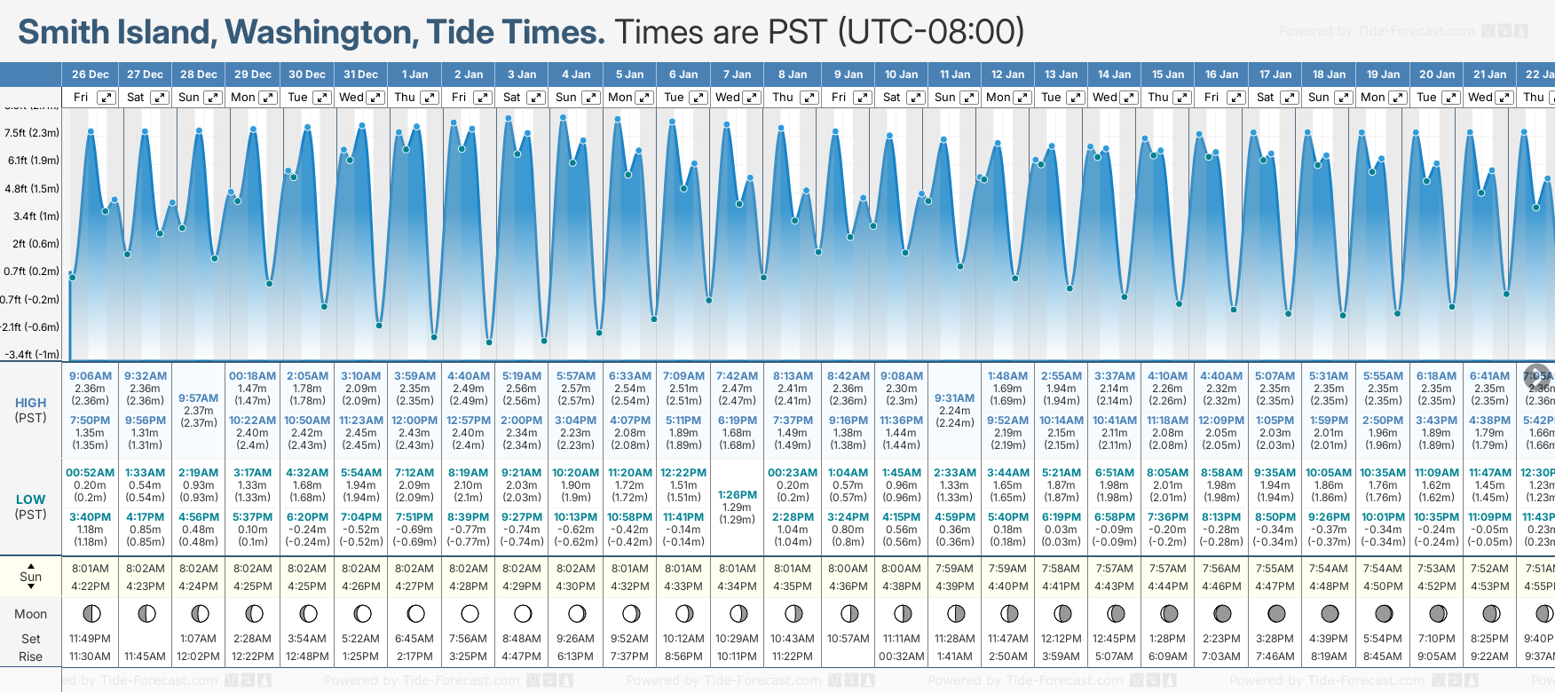 Tide chart for Smith IslandShowing low and high tide times for the next 30 days at Smith Island. Tide Times are PST (UTC -8.0hrs).