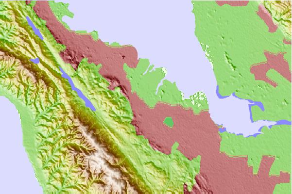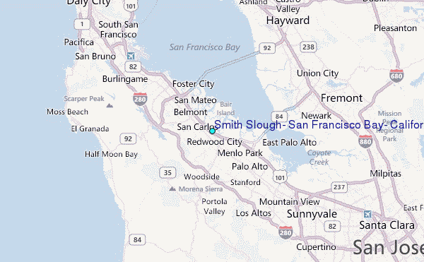 Use this relief map to navigate to tide stations, surf breaks and cities that are in the area of Smith Slough, San Francisco Bay, California.