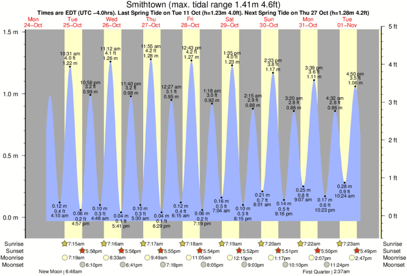 Tide Times are EST (UTC -5.0hrs). Last Spring High Tide at Smithtown was on Fri 05 Dec (height: 1.40m 4.6ft). Next high Spring Tide at Smithtown will be on Sat 03 Jan (height: 1.35m 4.4ft).