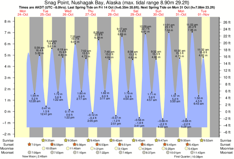 Snag Point, Nushagak Bay tide chart key: The tide chart above shows the height and times of high tide and low tide for Snag Point, Nushagak Bay, Alaska. The grey shading corresponds to nighttime hours between sunset and sunrise at Snag Point, Nushagak Bay.