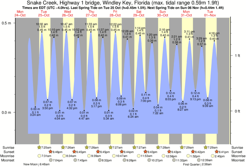 Tide Times are EST (UTC -5.0hrs). Last Spring High Tide at Snake Creek, Highway 1 bridge, Windley Key was on Fri 19 Dec (height: 0.34m 1.1ft). Next high Spring Tide at Snake Creek, Highway 1 bridge, Windley Key will be on Sat 03 Jan (height: 0.39m 1.3ft).