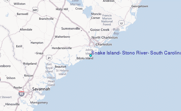 Use this relief map to navigate to tide stations, surf breaks and cities that are in the area of Snake Island, Stono River, South Carolina.
