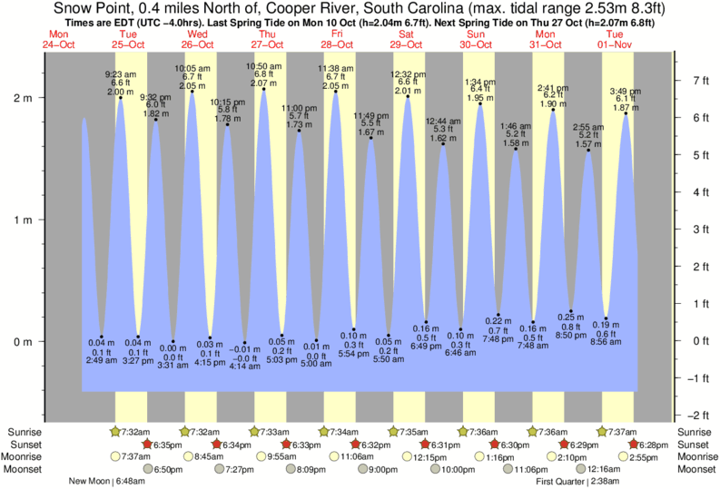 Tide chart for Snow Point, 0.4 miles North of, Cooper RiverShowing low and high tide times for the next 30 days at Snow Point, 0.4 miles North of, Cooper River. Tide Times are EST (UTC -5.0hrs).