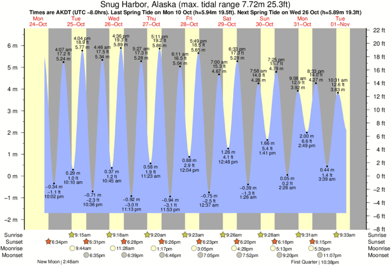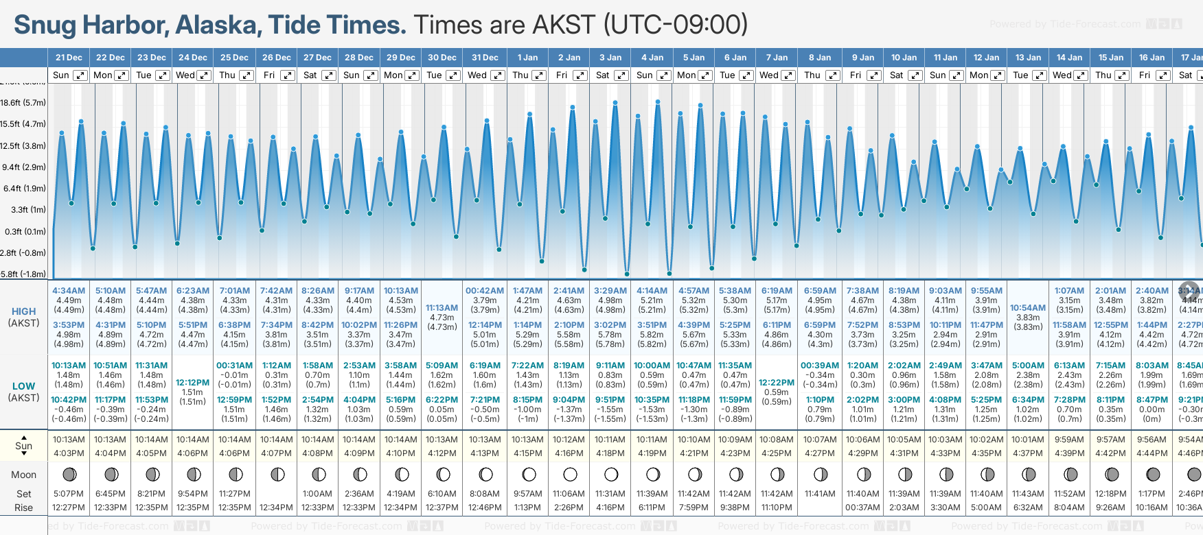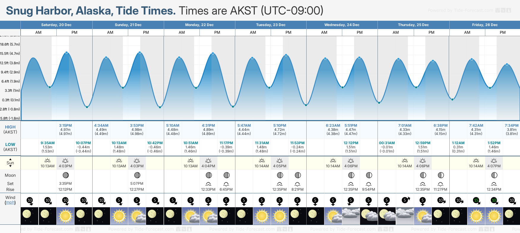 Tide Times are AKST (UTC -9.0hrs). Last Spring High Tide at Snug Harbor was on Fri 05 Dec (height: 6.04m 19.8ft). Next high Spring Tide at Snug Harbor will be on Sun 21 Dec (height: 4.98m 16.3ft).