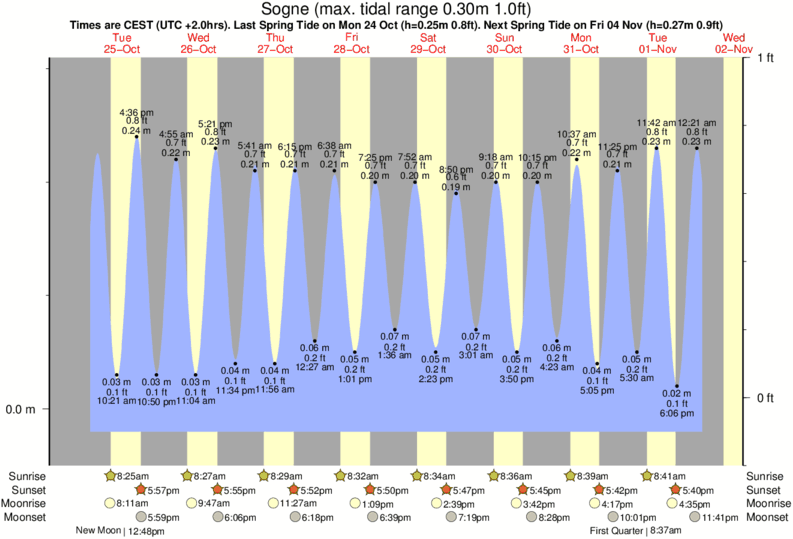 Tide Times are CET (UTC +1.0hrs). Last Spring High Tide at Sogne was on Tue 16 Dec (height: 0.24m 0.8ft). Next high Spring Tide at Sogne will be on Wed 31 Dec (height: 0.26m 0.9ft).
