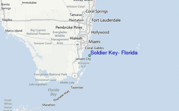 Use this relief map to navigate to tide stations, surf breaks and cities that are in the area of Soldier Key, Florida.