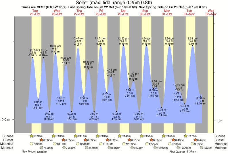 December and January Tide charts for Soller: The tide charts below show the height, time and date of high and low tides for the next 30 days.