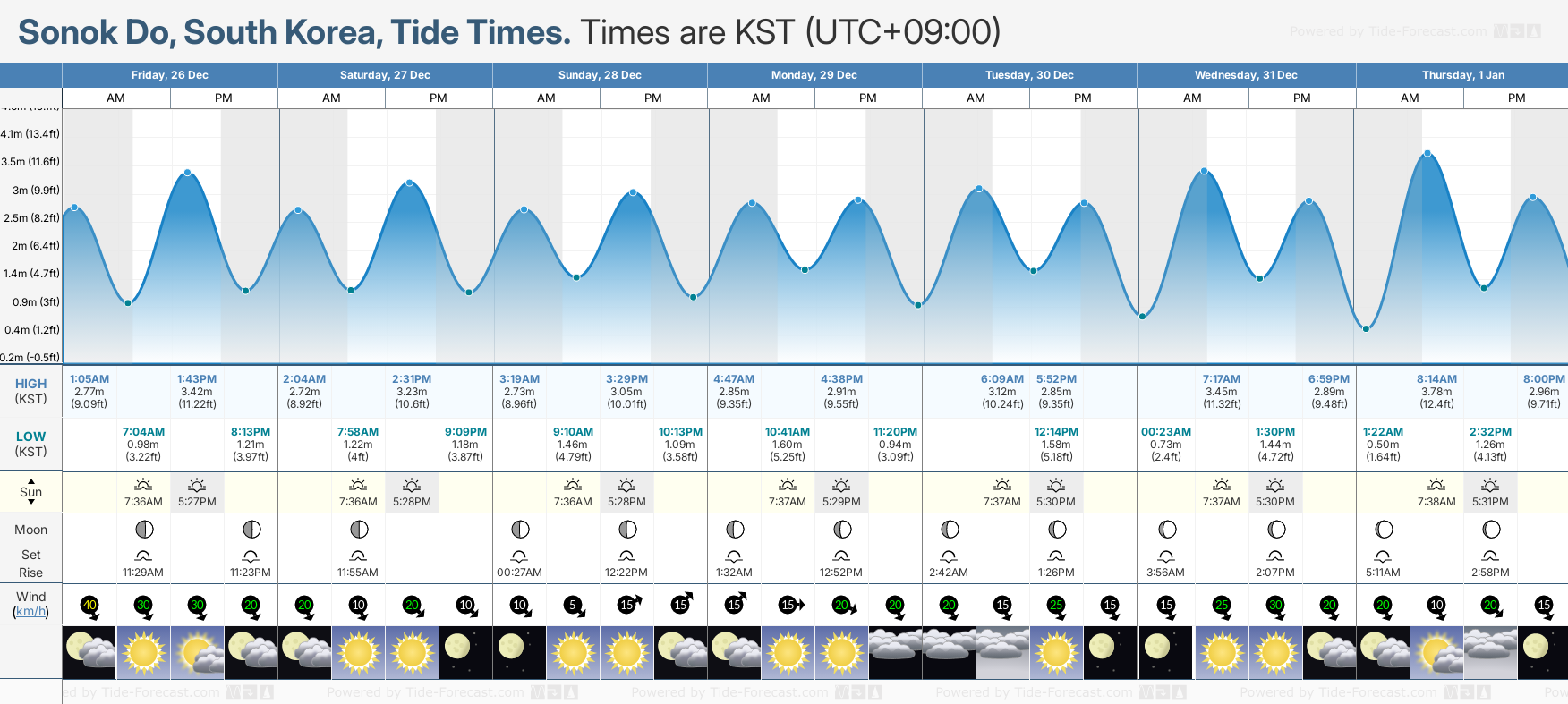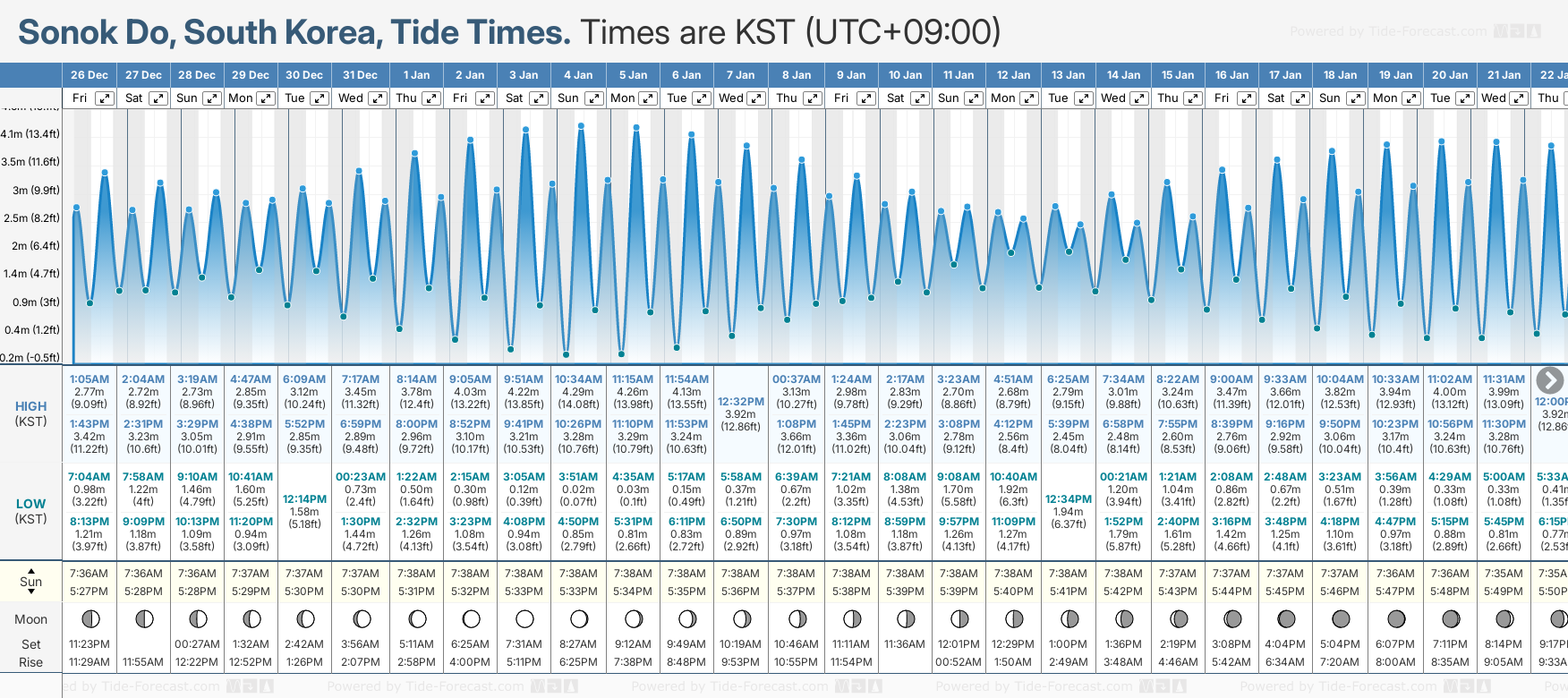 Tide Times are KST (UTC +9.0hrs). Last Spring High Tide at Sonok Do was on Sun 21 Dec (height: 3.84m 12.6ft). Next high Spring Tide at Sonok Do will be on Sun 04 Jan (height: 4.29m 14.1ft).