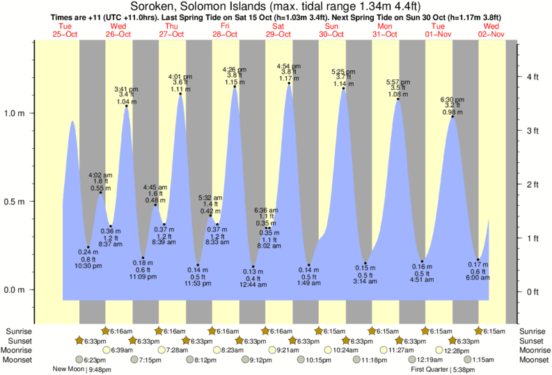 Soroken tide chart key: The tide chart above shows the height and times of high tide and low tide for Soroken, Solomon Islands. The grey shading corresponds to nighttime hours between sunset and sunrise at Soroken.