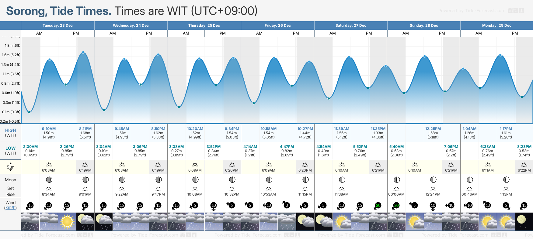 Tide Times are WIT (UTC +9.0hrs). Last Spring High Tide at Sorong was on Mon 22 Dec (height: 1.71m 5.6ft). Next high Spring Tide at Sorong will be on Mon 05 Jan (height: 1.91m 6.3ft).