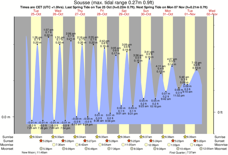 Tide Times are CET (UTC +1.0hrs). Last Spring High Tide at Sousse was on Mon 08 Dec (height: 0.20m 0.7ft). Next high Spring Tide at Sousse will be on Sun 21 Dec (height: 0.20m 0.7ft).