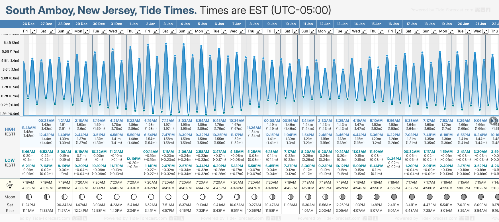 December and January Tide charts for South Amboy: The tide charts below show the height, time and date of high and low tides for the next 30 days.