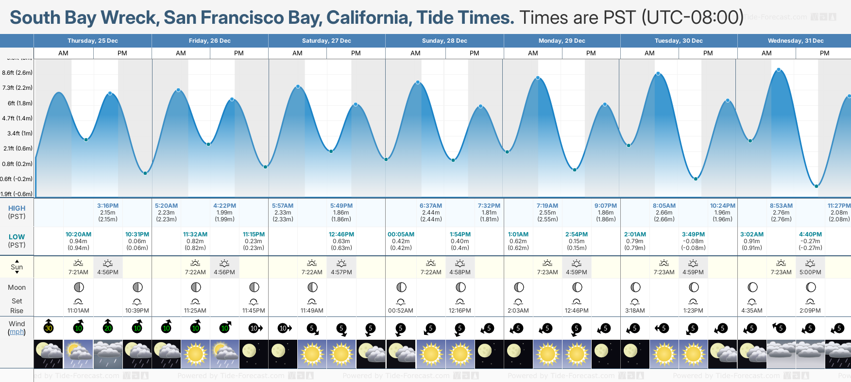 Tide chart for South Bay Wreck, San Francisco BayShowing low and high tide times for the next 30 days at South Bay Wreck, San Francisco Bay. Tide Times are PST (UTC -8.0hrs).
