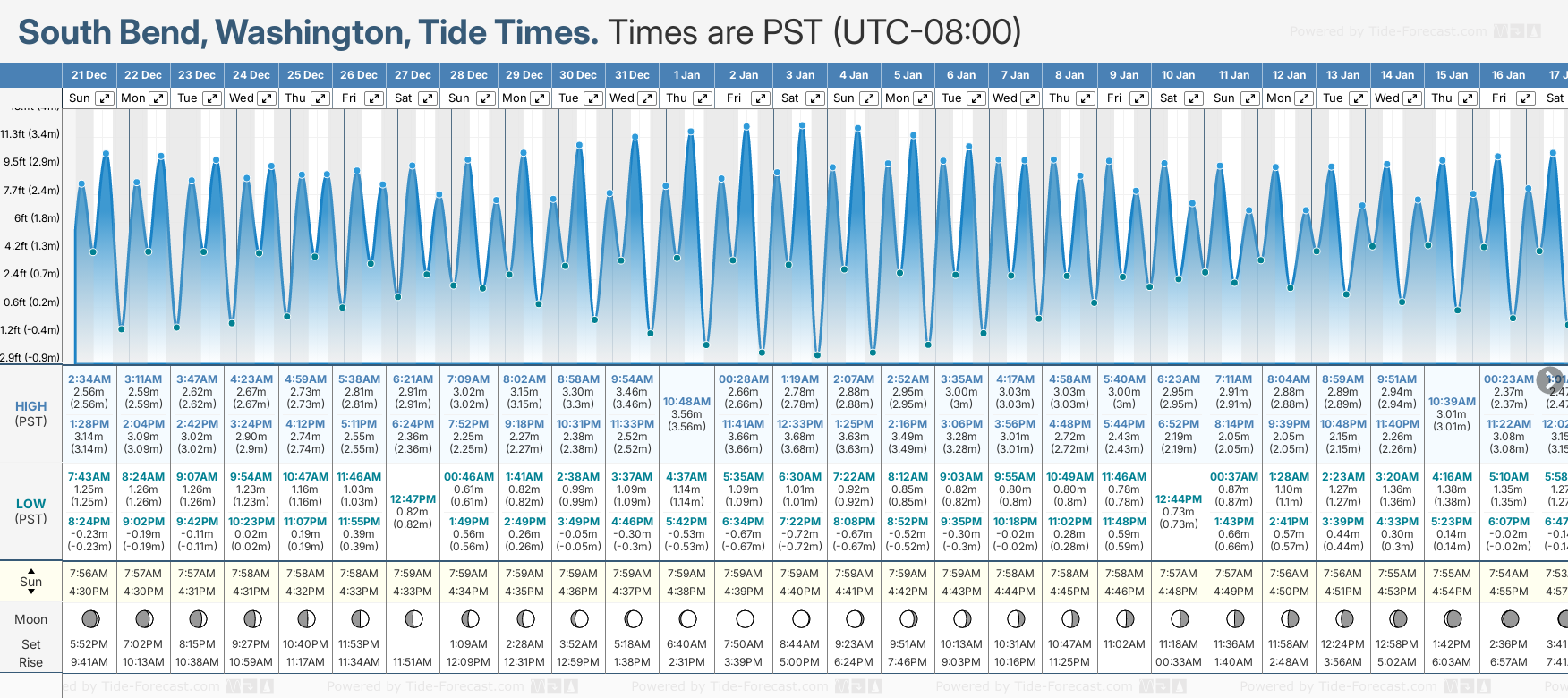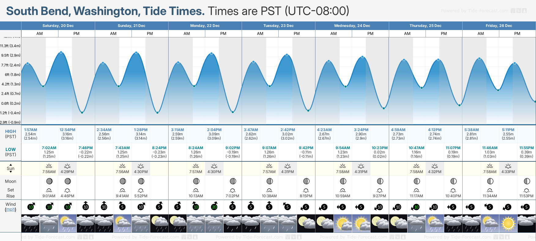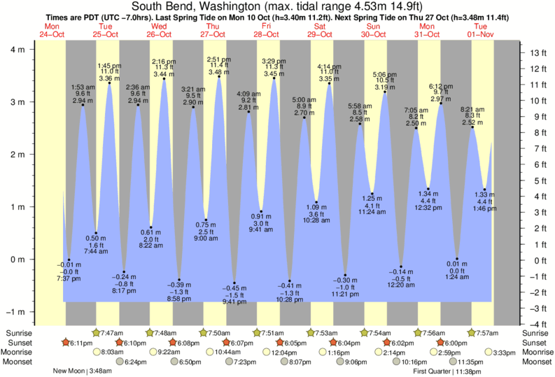 Tide Times are PST (UTC -8.0hrs). Last Spring High Tide at South Bend was on Fri 05 Dec (height: 3.79m 12.4ft). Next high Spring Tide at South Bend will be on Sat 20 Dec (height: 3.16m 10.4ft).