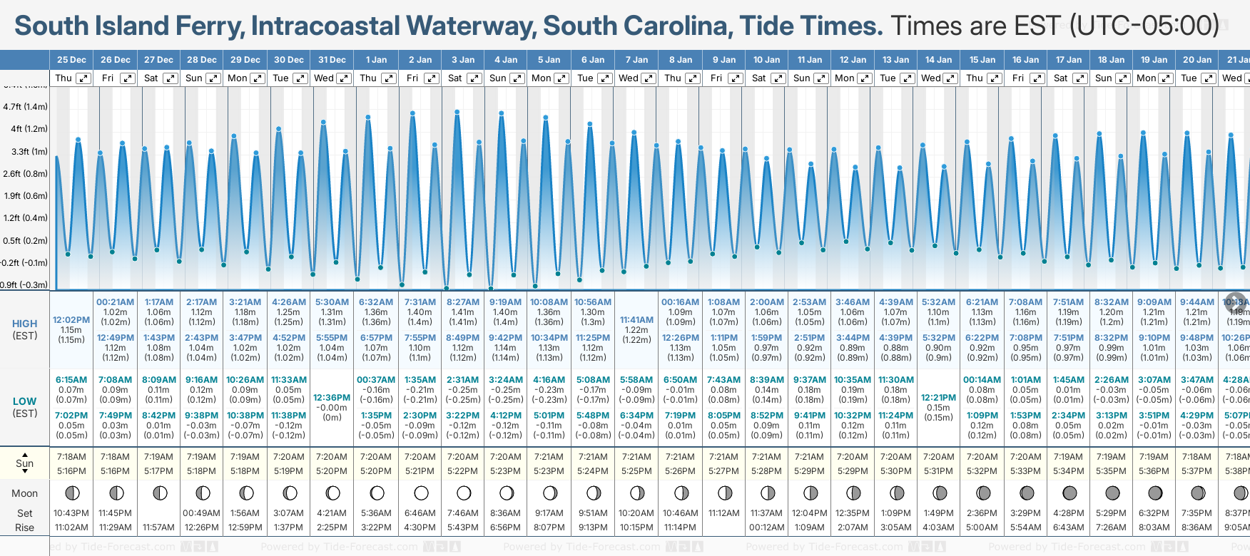 Tide chart for South Island Ferry, Intracoastal WaterwayShowing low and high tide times for the next 30 days at South Island Ferry, Intracoastal Waterway. Tide Times are EST (UTC -5.0hrs).