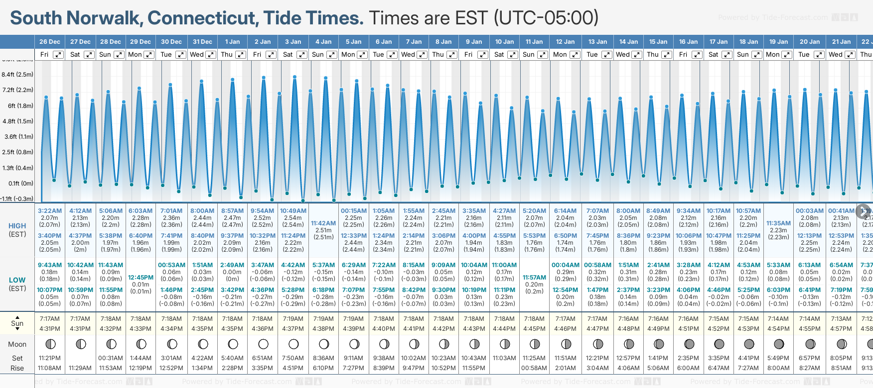 December and January Tide charts for East Norwalk: The tide charts below show the height, time and date of high and low tides for the next 30 days.