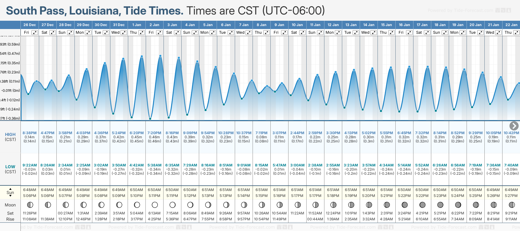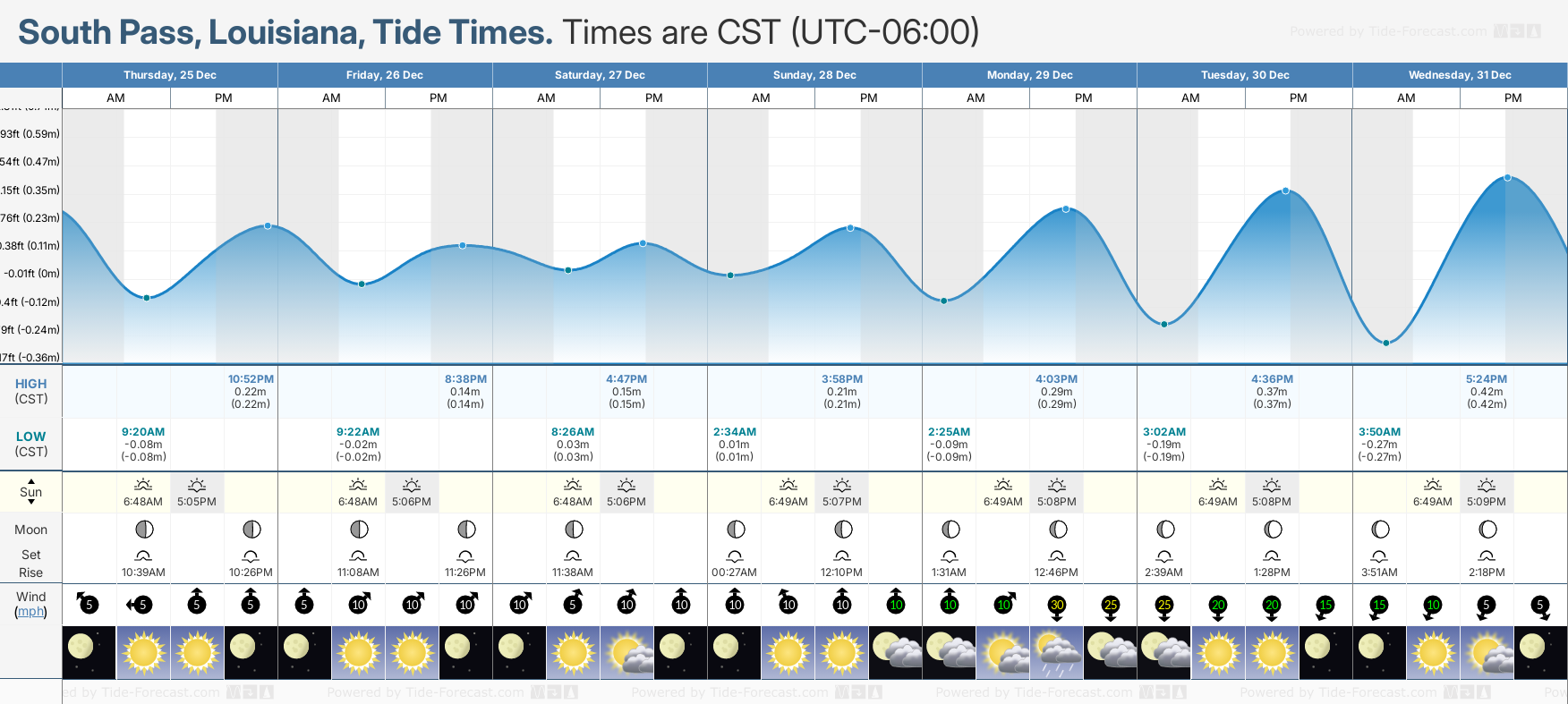 Tide chart for South PassShowing low and high tide times for the next 30 days at South Pass. Tide Times are CST (UTC -6.0hrs).