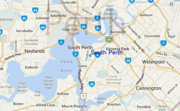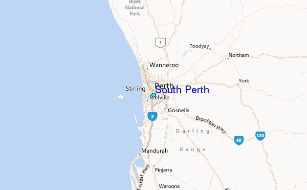 Use this relief map to navigate to tide stations, surf breaks and cities that are in the area of South Perth.