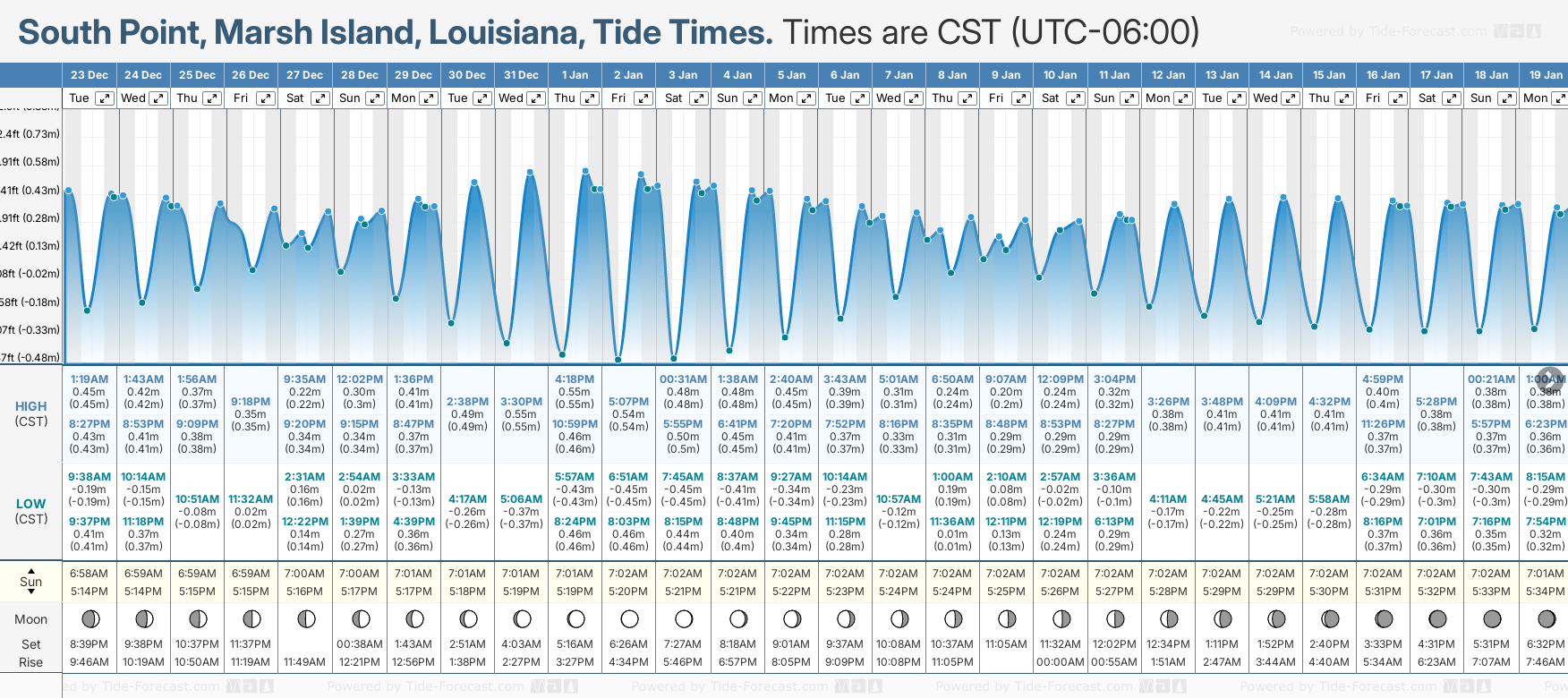 Tide Times are CST (UTC -6.0hrs). Last Spring High Tide at South Point, Marsh Island was on Thu 18 Dec (height: 0.52m 1.7ft). Next high Spring Tide at South Point, Marsh Island will be on Wed 31 Dec (height: 0.55m 1.8ft).