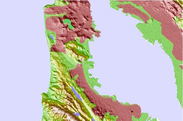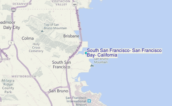 Use this relief map to navigate to tide stations, surf breaks and cities that are in the area of South San Francisco, San Francisco Bay, California.