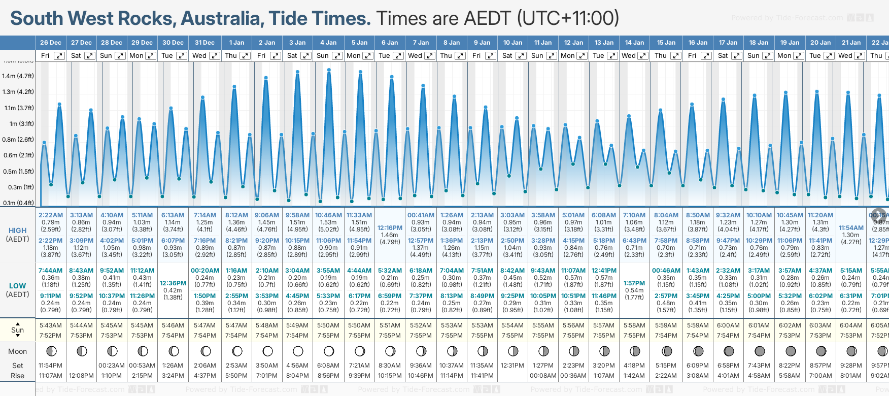 December and January Tide charts for South West Rocks: The tide charts below show the height, time and date of high and low tides for the next 30 days.