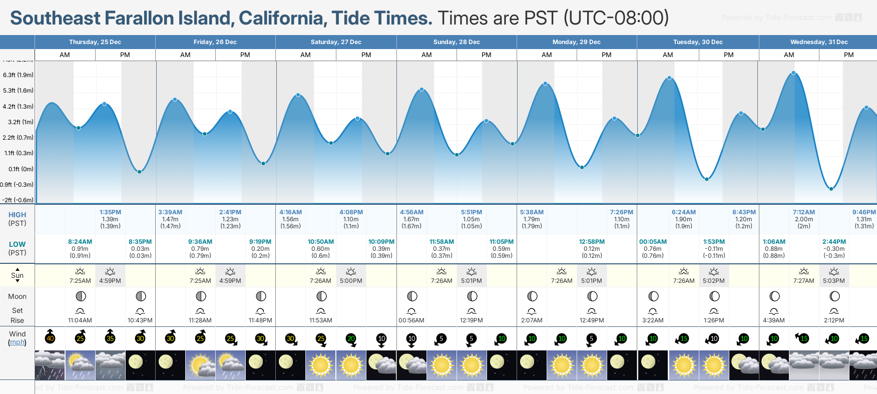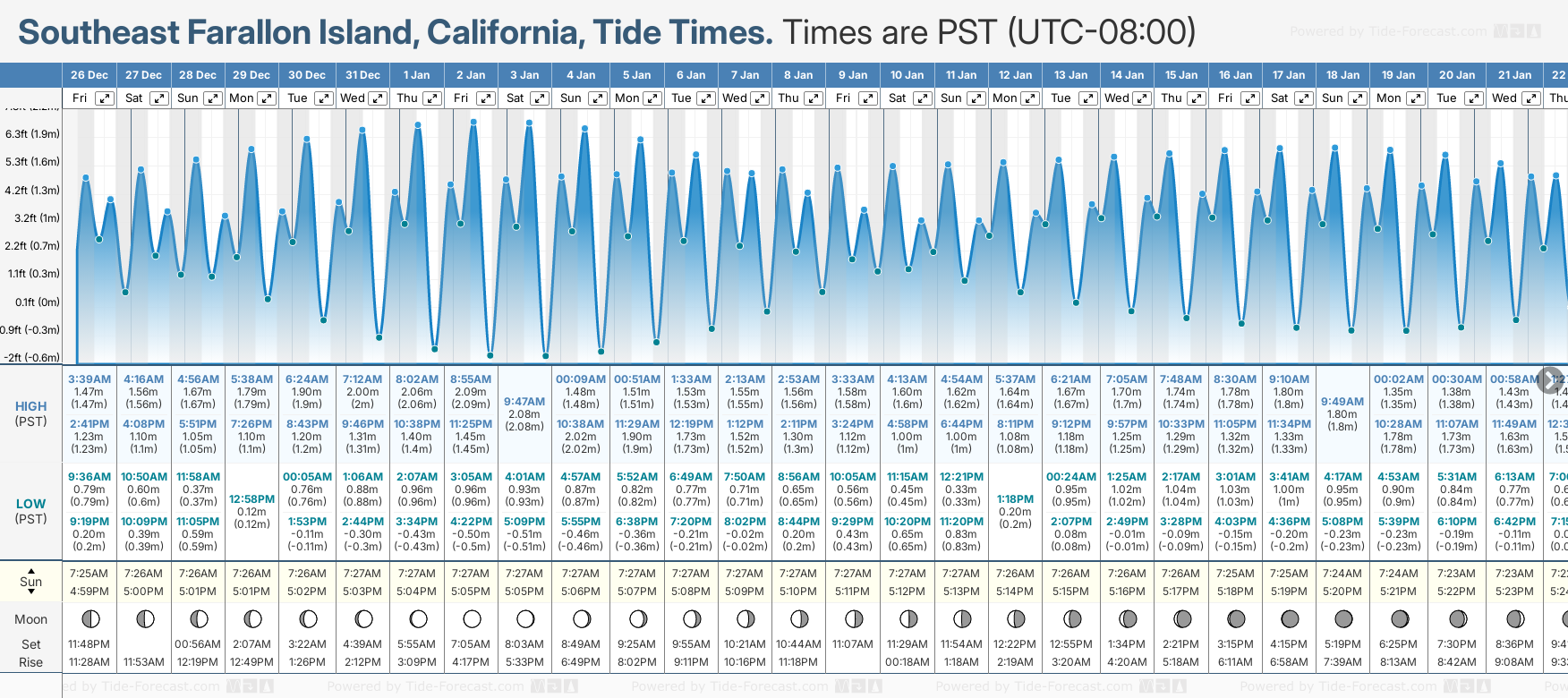 December and January Tide charts for Southeast Farallon Island: The tide charts below show the height, time and date of high and low tides for the next 30 days.