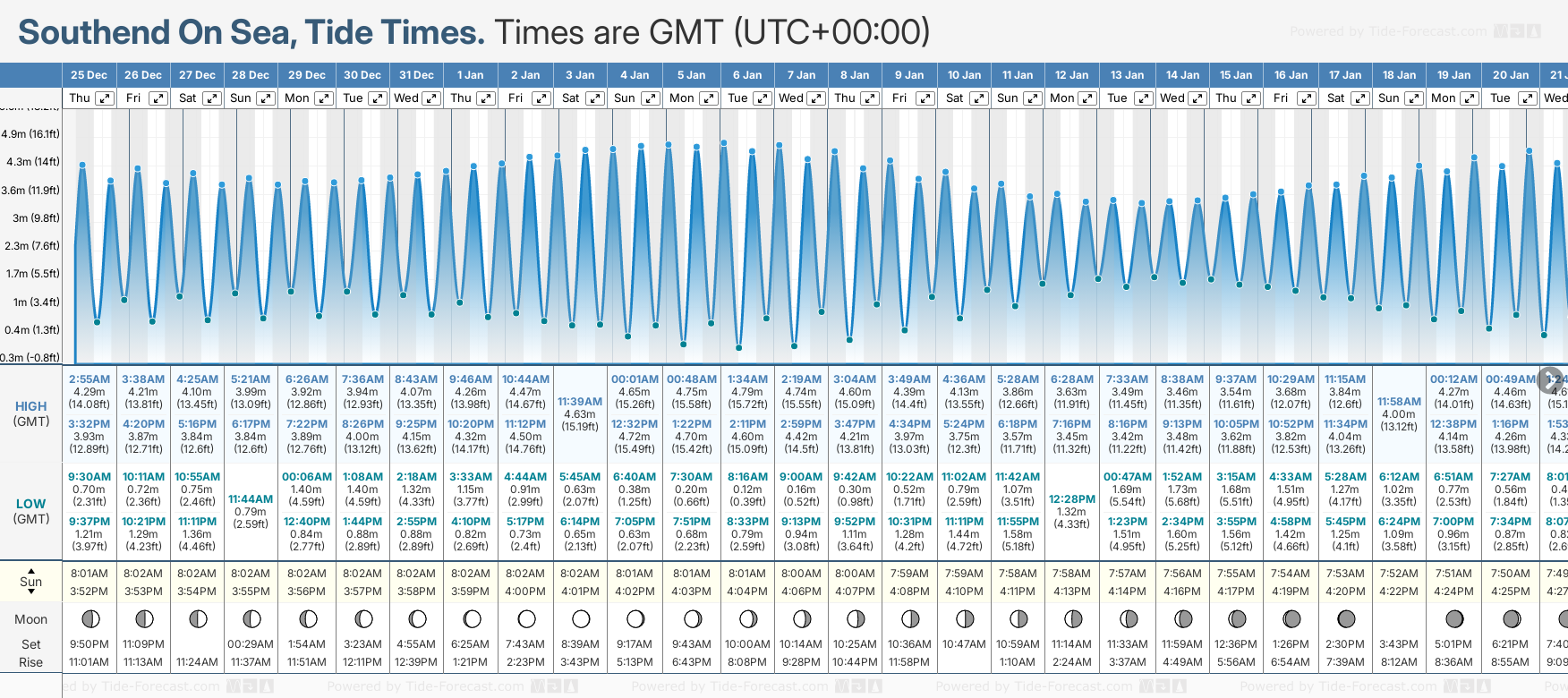 December and January Tide charts for Southend On Sea: The tide charts below show the height, time and date of high and low tides for the next 30 days.