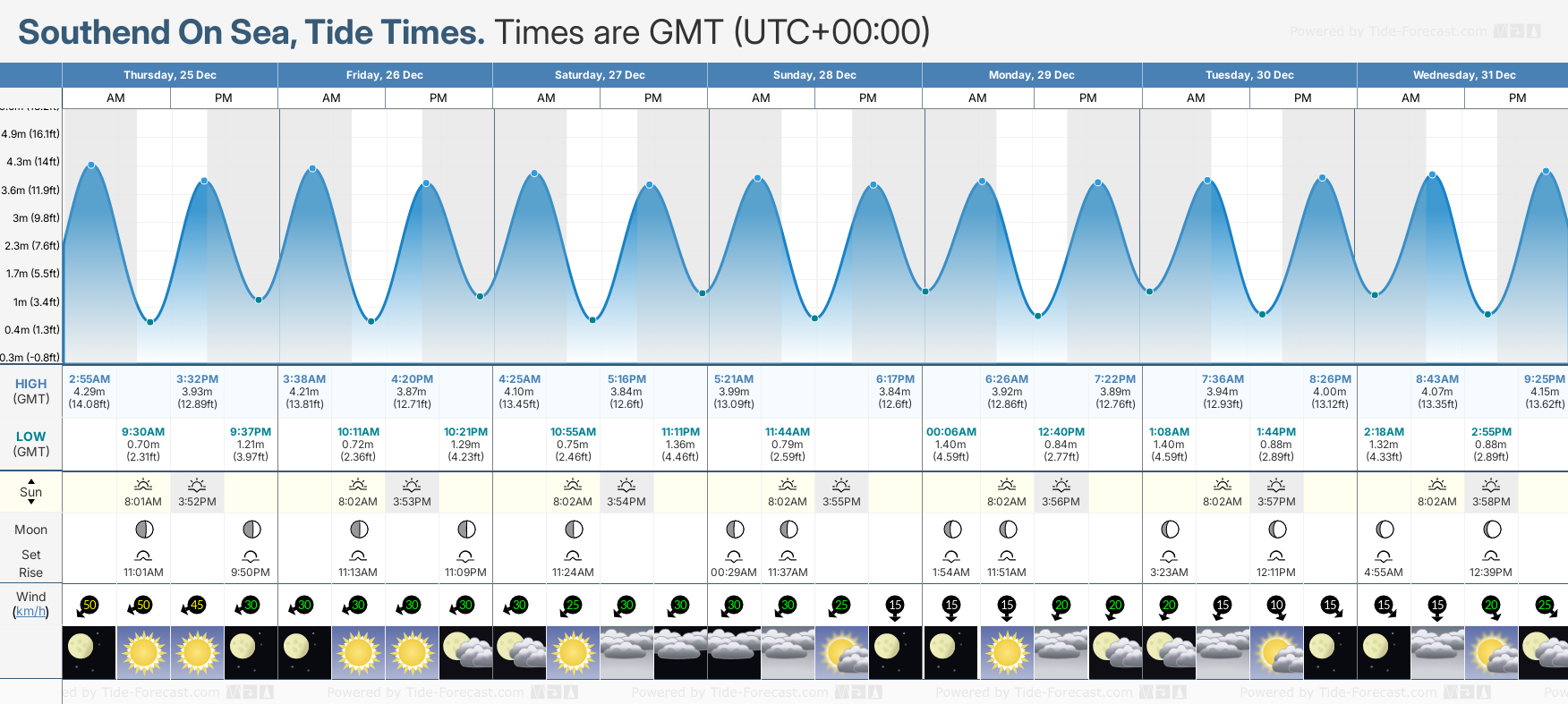 Tide chart for Southend On SeaShowing low and high tide times for the next 30 days at Southend On Sea. Tide Times are GMT (UTC +0hrs).