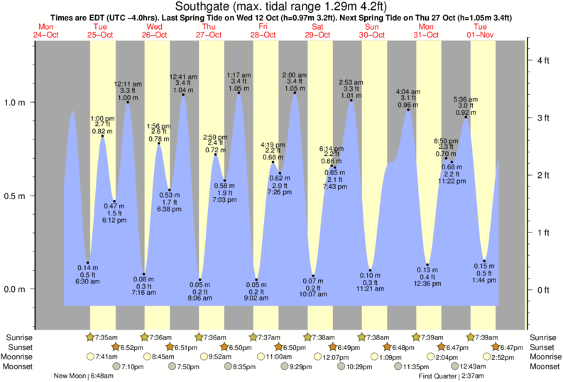 Tide Times are EST (UTC -5.0hrs). Last Spring High Tide at Southgate was on Fri 05 Dec (height: 1.19m 3.9ft). Next high Spring Tide at Southgate will be on Sat 20 Dec (height: 1.05m 3.4ft).