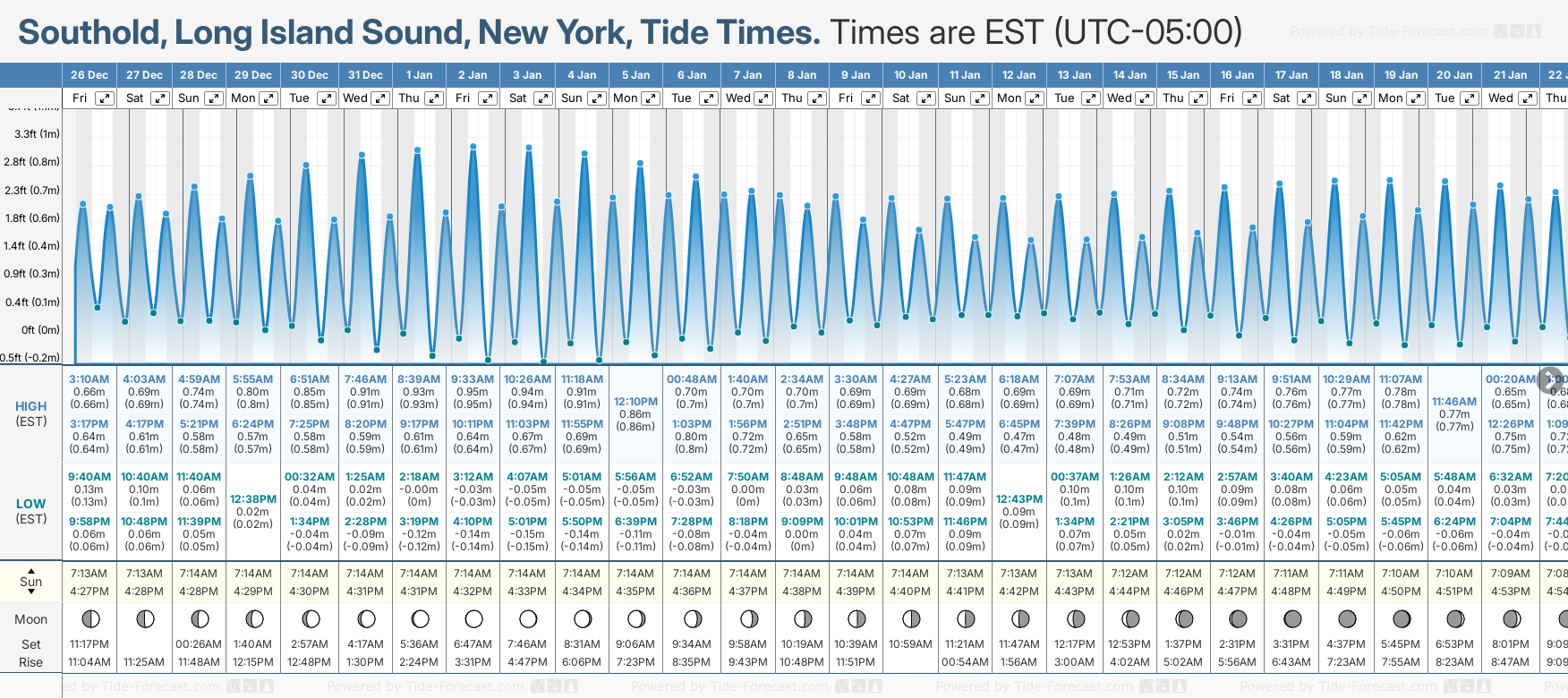 December and January Tide charts for Southold, Long Island Sound: The tide charts below show the height, time and date of high and low tides for the next 30 days.