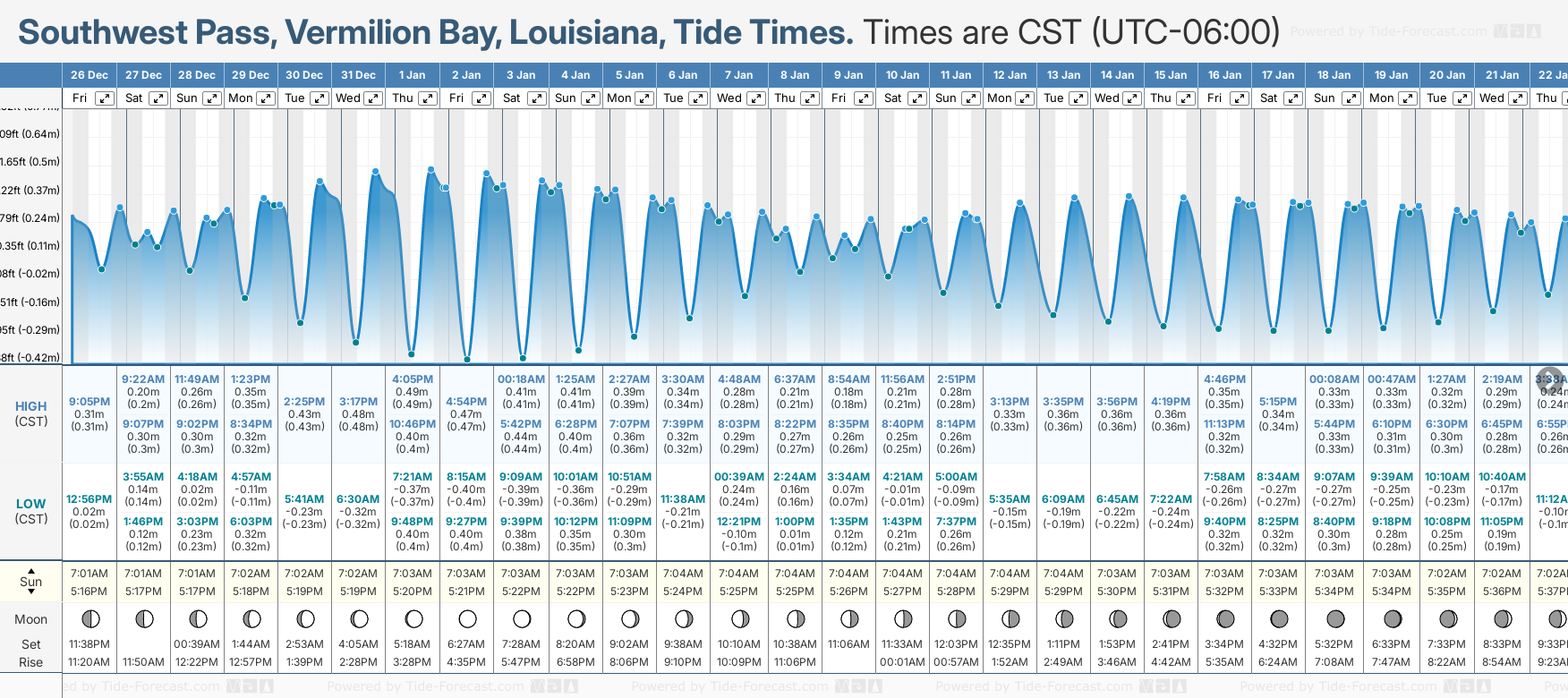 December and January Tide charts for Southwest Pass, Vermilion Bay: The tide charts below show the height, time and date of high and low tides for the next 30 days.