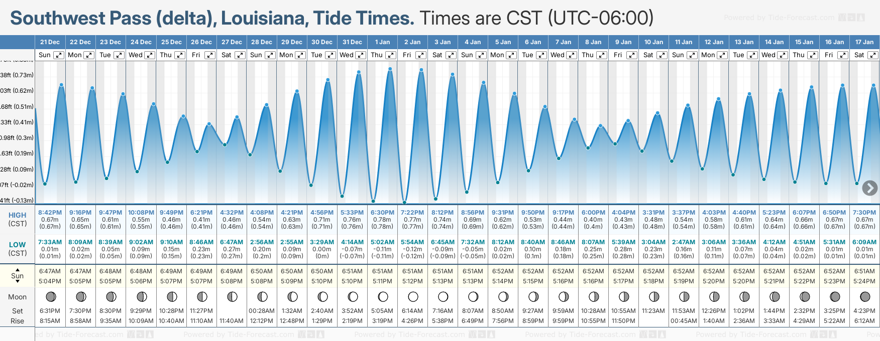 December and January Tide charts for Southwest Pass (delta): The tide charts below show the height, time and date of high and low tides for the next 30 days.