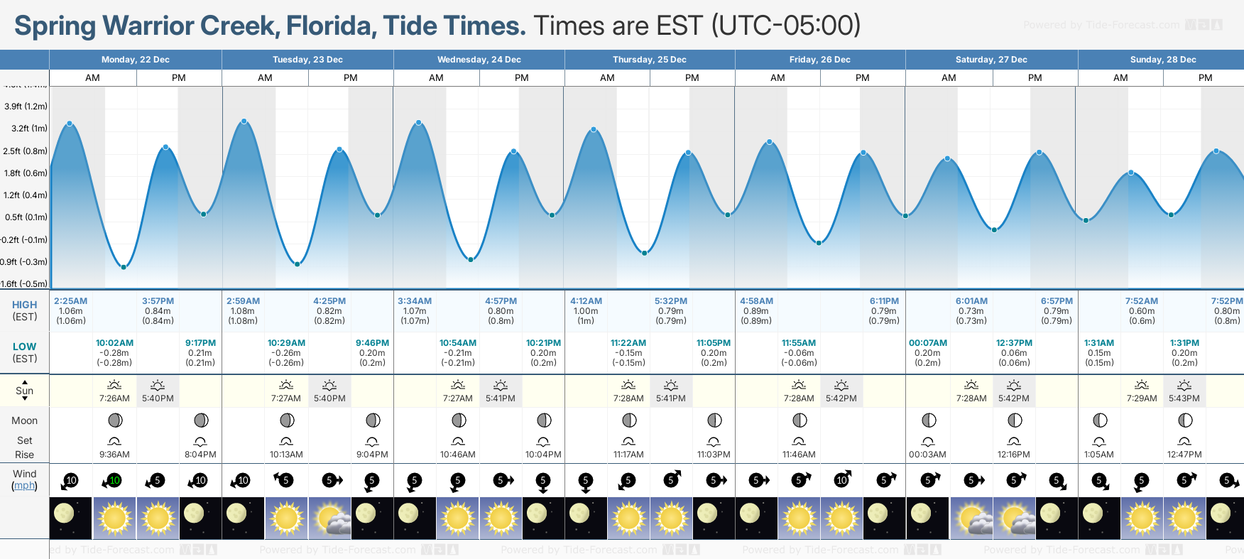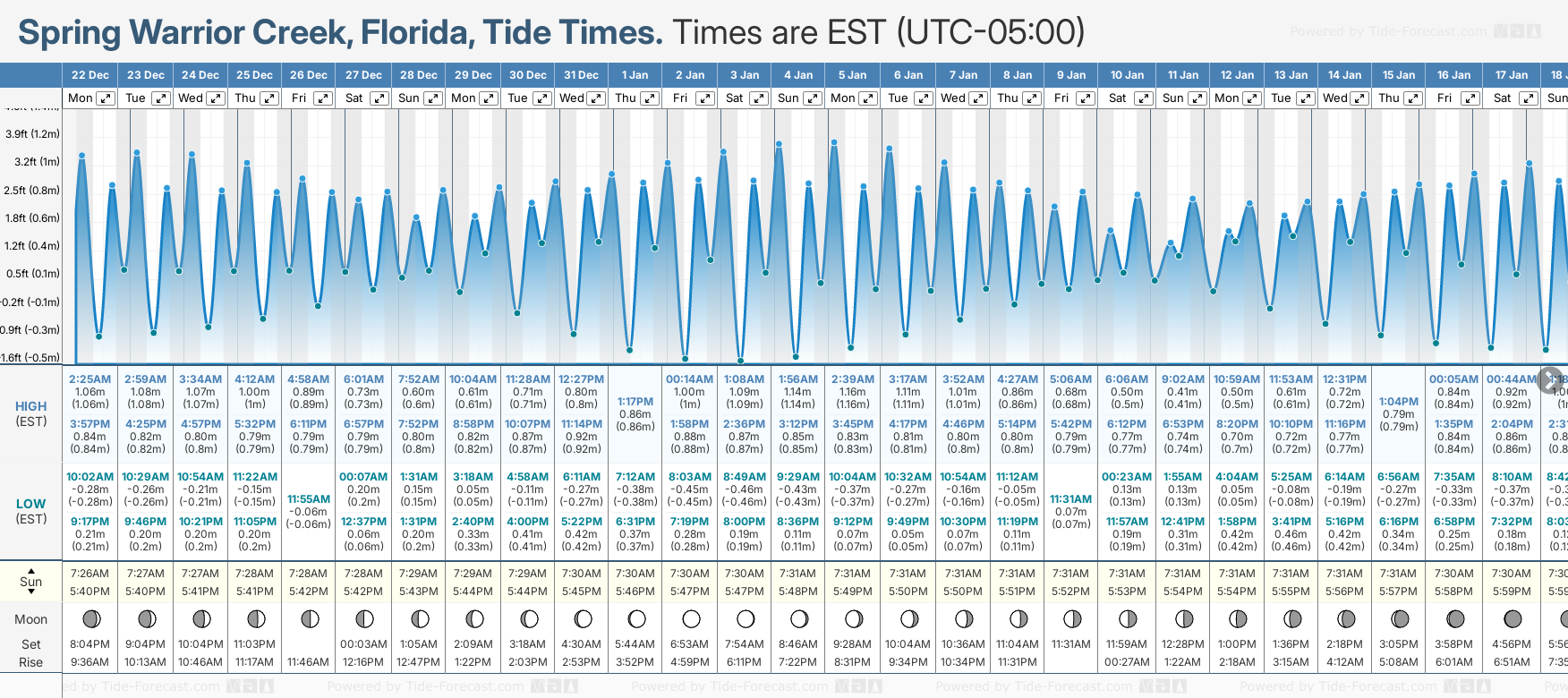Tide Times are EST (UTC -5.0hrs). Last Spring High Tide at Spring Warrior Creek was on Sat 06 Dec (height: 1.15m 3.8ft). Next high Spring Tide at Spring Warrior Creek will be on Mon 22 Dec (height: 1.08m 3.5ft).