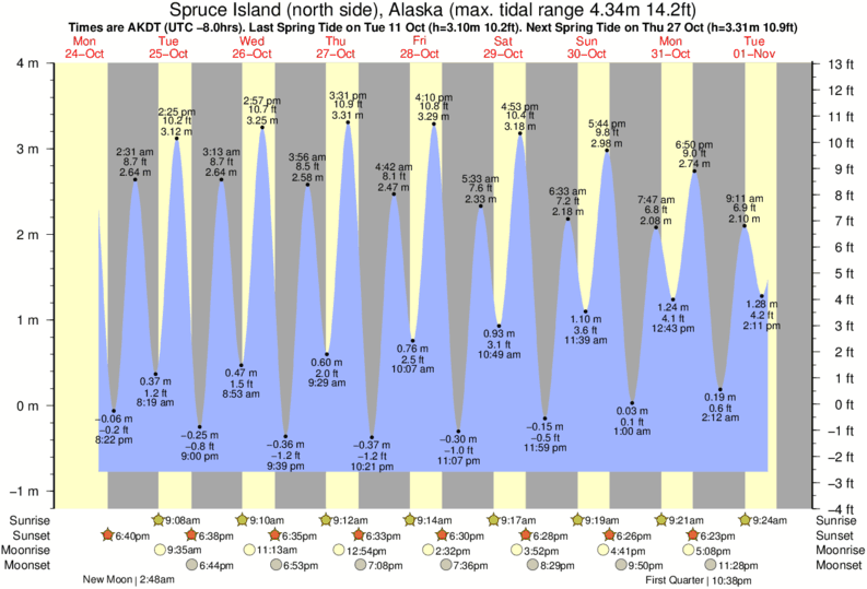Tide Times are AKST (UTC -9.0hrs). Last Spring High Tide at Spruce Island (north side) was on Fri 05 Dec (height: 3.63m 11.9ft). Next high Spring Tide at Spruce Island (north side) will be on Sat 03 Jan (height: 3.51m 11.5ft).