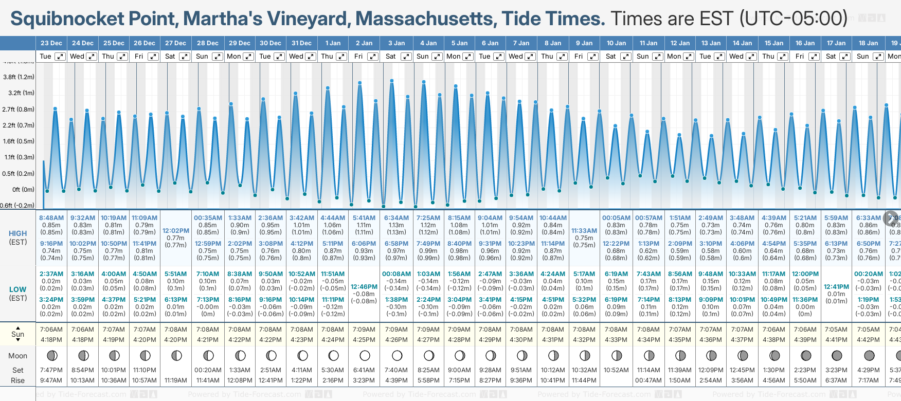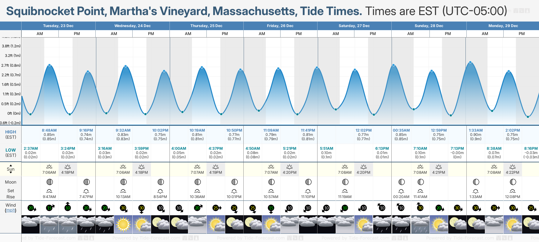Tide chart for Squibnocket Point, Martha's VineyardShowing low and high tide times for the next 30 days at Squibnocket Point, Martha's Vineyard. Tide Times are EST (UTC -5.0hrs).