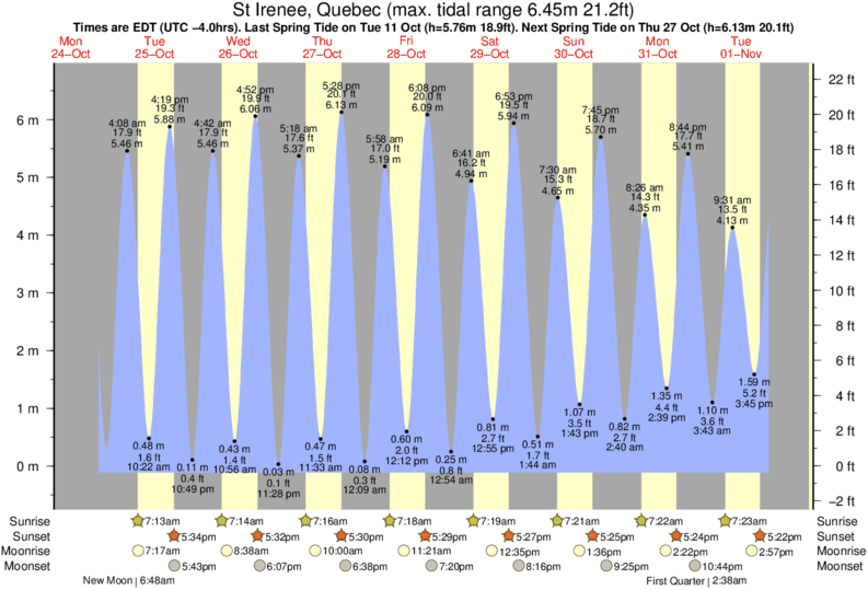Tide Times are EST (UTC -5.0hrs). Last Spring High Tide at St Irenee was on Fri 05 Dec (height: 6.41m 21.0ft). Next high Spring Tide at St Irenee will be on Sun 04 Jan (height: 6.13m 20.1ft).
