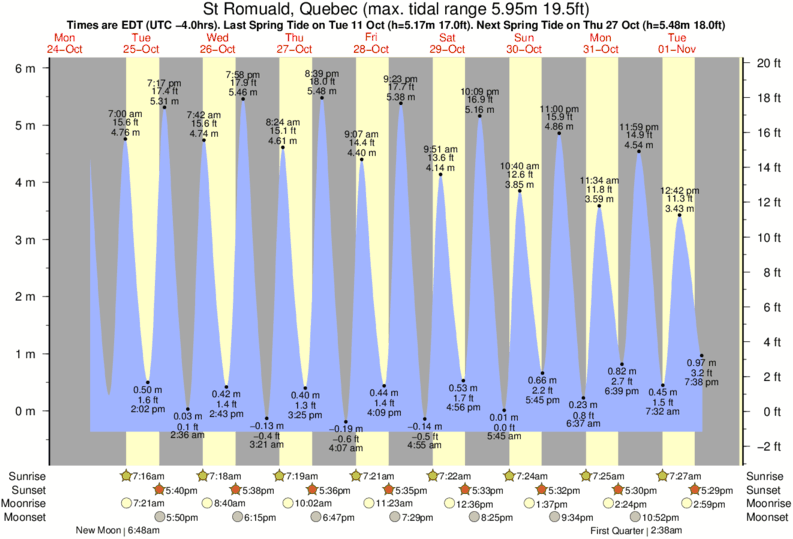 Tide Times are EST (UTC -5.0hrs). Last Spring High Tide at St Romuald was on Fri 05 Dec (height: 5.56m 18.2ft). Next high Spring Tide at St Romuald will be on Mon 22 Dec (height: 5.05m 16.6ft).