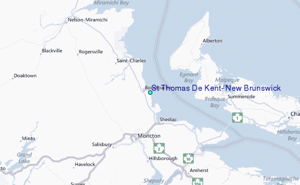 Use this relief map to navigate to tide stations, surf breaks and cities that are in the area of St Thomas De Kent, New Brunswick.