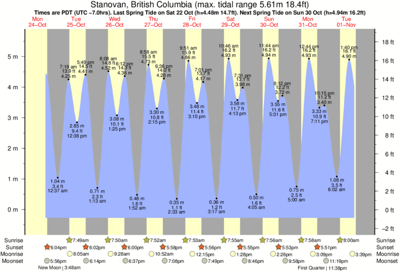 Tide Times are PST (UTC -8.0hrs). Last Spring High Tide at Stanovan was on Sun 07 Dec (height: 5.24m 17.2ft). Next high Spring Tide at Stanovan will be on Tue 23 Dec (height: 5.05m 16.6ft).