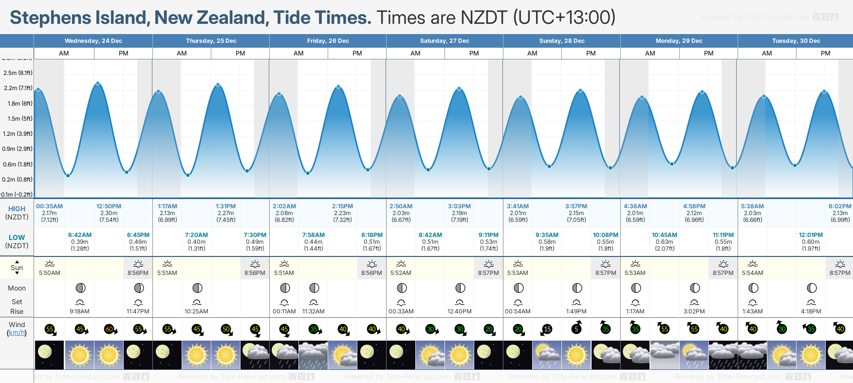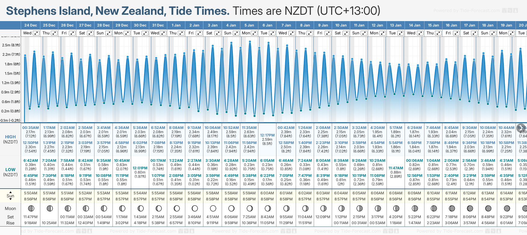 December and January Tide charts for Stephens Island: The tide charts below show the height, time and date of high and low tides for the next 30 days.