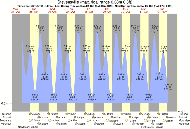 Tide Times are EST (UTC -5.0hrs). Last Spring High Tide at Stevensville was on Thu 18 Dec (height: 0.06m 0.2ft). Next high Spring Tide at Stevensville will be on Tue 23 Dec (height: 0.06m 0.2ft).