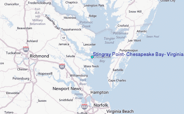 Use this relief map to navigate to tide stations, surf breaks and cities that are in the area of Stingray Point, Chesapeake Bay, Virginia.