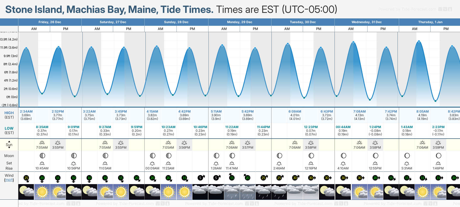 December and January Tide charts for Stone Island, Machias Bay: The tide charts below show the height, time and date of high and low tides for the next 30 days.