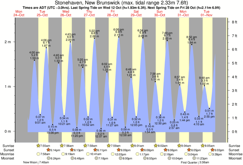 Stonehaven tide chart key: The tide chart above shows the height and times of high tide and low tide for Stonehaven, New Brunswick. The grey shading corresponds to nighttime hours between sunset and sunrise at Stonehaven.