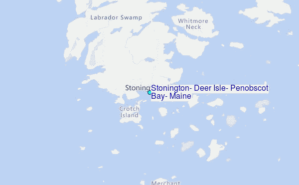 Use this relief map to navigate to tide stations, surf breaks and cities that are in the area of Stonington, Deer Isle, Penobscot Bay, Maine.