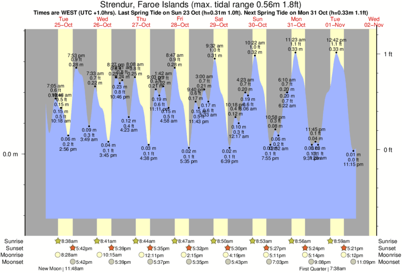 December and January Tide charts for Strendur: The tide charts below show the height, time and date of high and low tides for the next 30 days.