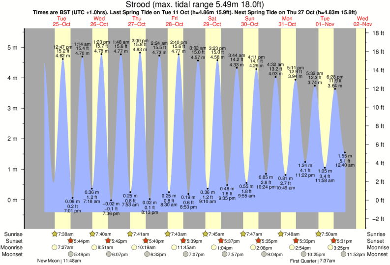 Tide Times are GMT (UTC +0hrs). Last Spring High Tide at Strood was on Sat 06 Dec (height: 4.92m 16.1ft). Next high Spring Tide at Strood will be on Tue 23 Dec (height: 4.34m 14.2ft).