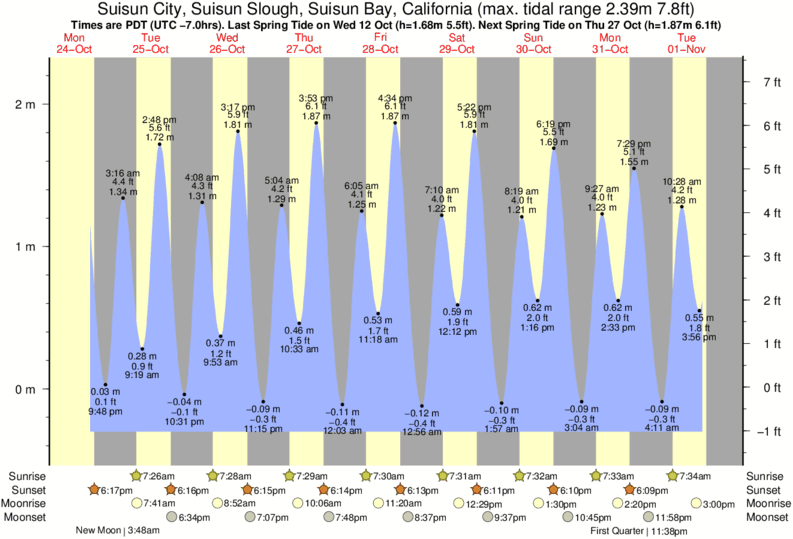 Tide Times are PST (UTC -8.0hrs). Last Spring High Tide at Suisun City, Suisun Slough, Suisun Bay was on Fri 05 Dec (height: 2.03m 6.7ft). Next high Spring Tide at Suisun City, Suisun Slough, Suisun Bay will be on Fri 02 Jan (height: 2.00m 6.6ft).