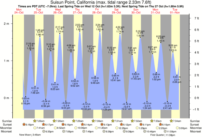 Tide Times are PST (UTC -8.0hrs). Last Spring High Tide at Suisun Point was on Sat 20 Dec (height: 1.74m 5.7ft). Next high Spring Tide at Suisun Point will be on Fri 02 Jan (height: 1.95m 6.4ft).
