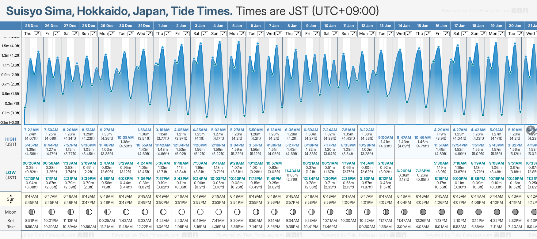 December and January Tide charts for Suisyo Sima: The tide charts below show the height, time and date of high and low tides for the next 30 days.